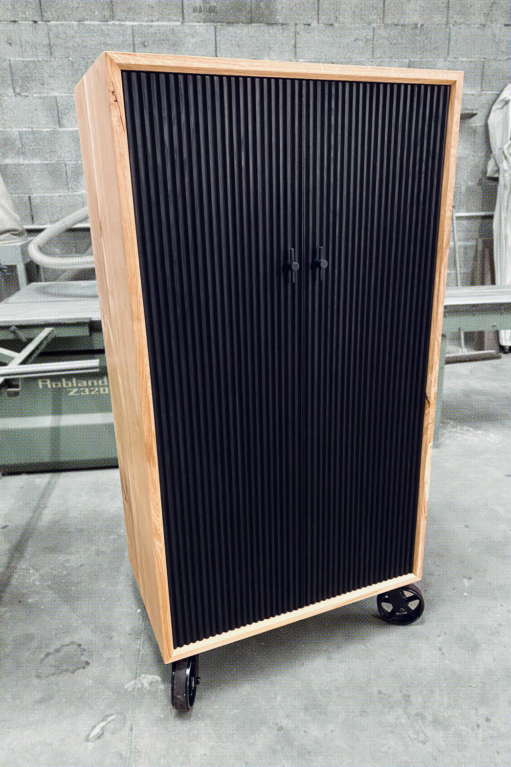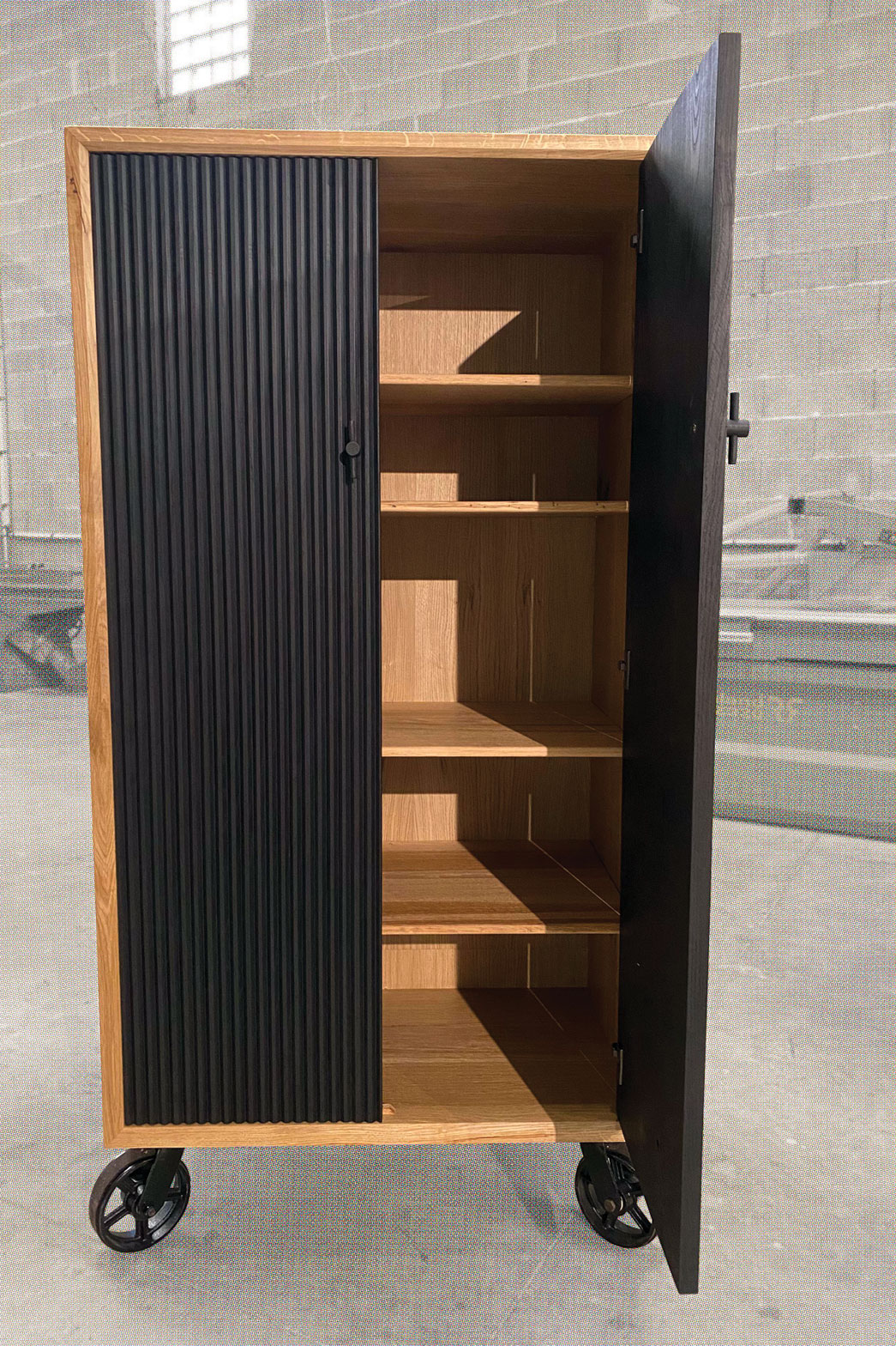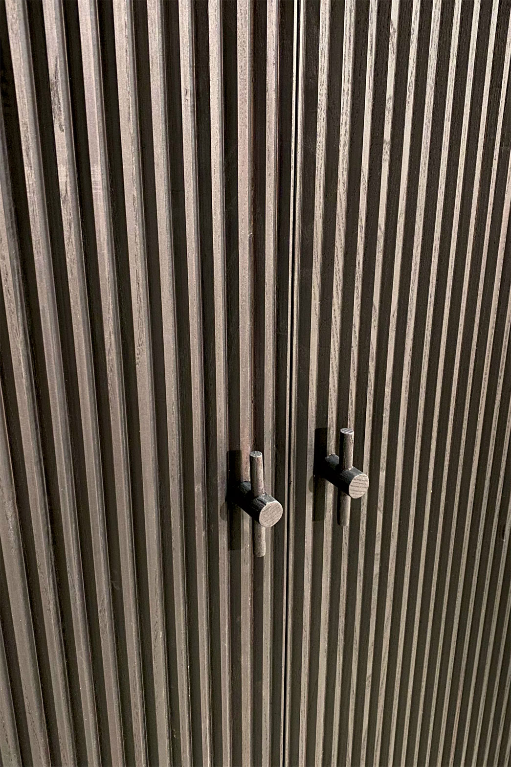 With corrugated ash doors stained in deep black.